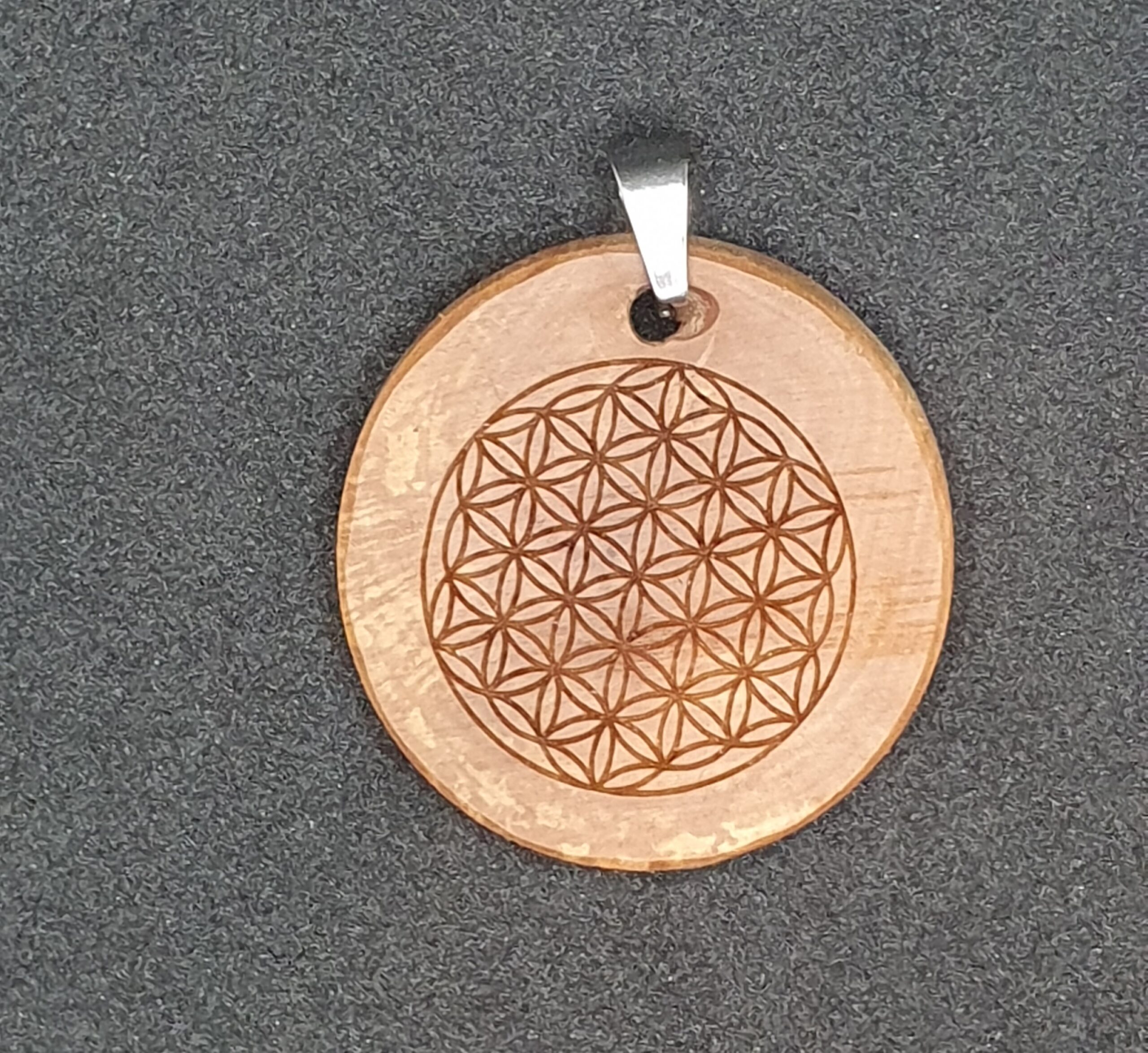 Anhänger „Blume des Lebens“ ca 40 mm DM, 4 mm Olivenholz, gebrannt und mit Ölivenöl gebeizt.