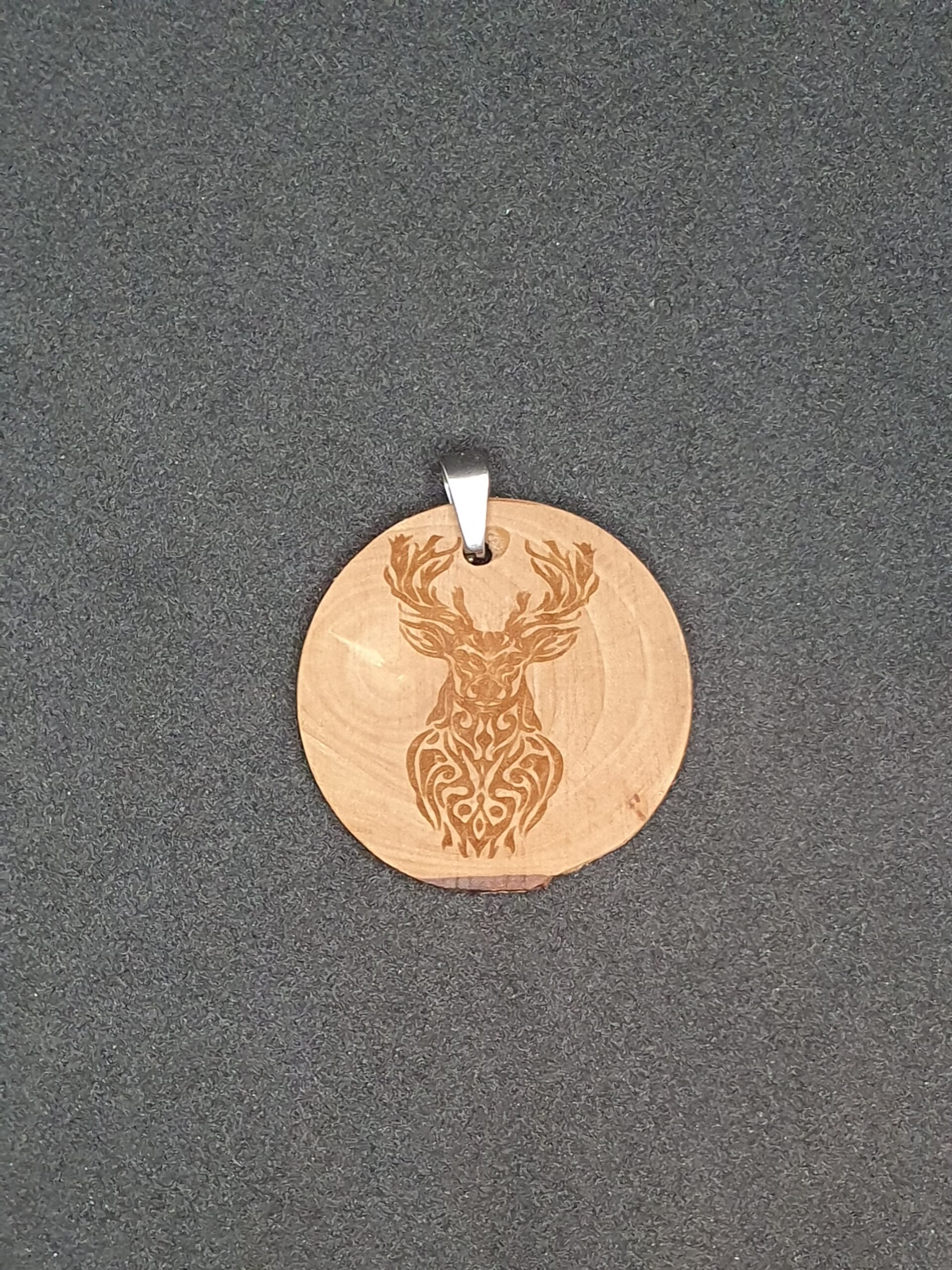 Anhänger „Hirsch“ ca 35 mm DM, 3 mm Olivenholz, gebrannt und mit Ölivenöl gebeizt.